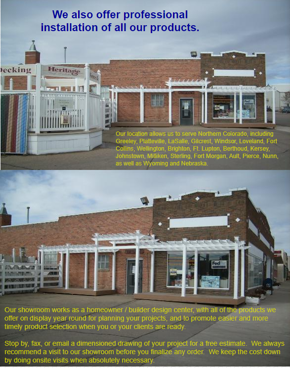 Located in Eaton, CO (since 1993), in a historic 100-year-old building, our 10,000 s.f. facility provides retail and wholesale customers with the best vinyl and composite products available in the fence and deck industry, as well as competitive pricing on cedar and treated wood. Our showroom displays every fence and deck product option that we have chosen to offer to our clientele.